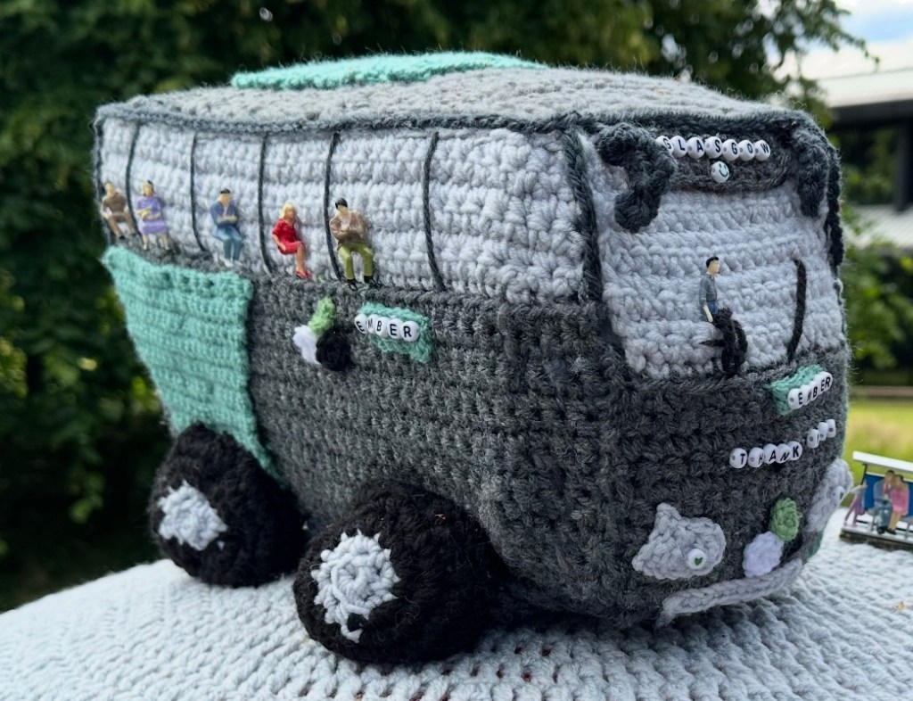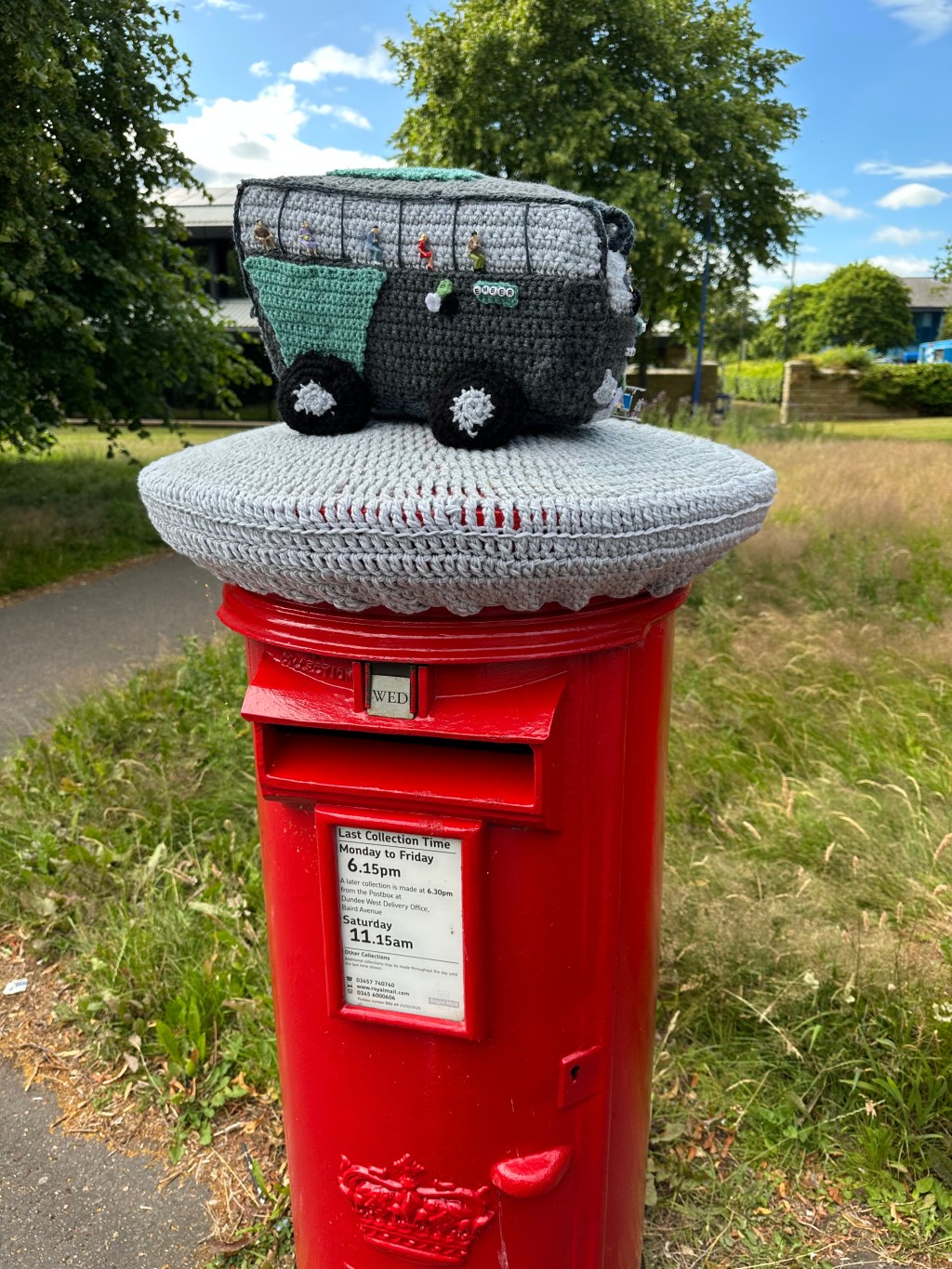 My daughter was in Scotland recently. When she got off the bus, she saw this knitted bus above the mail box. How wonderful.