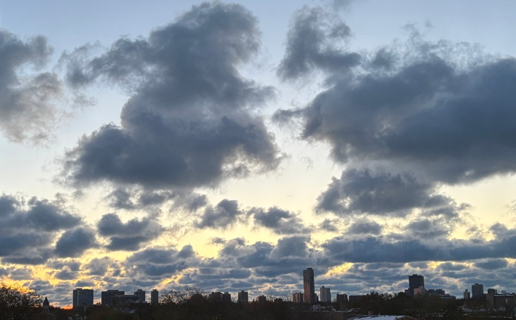 I opened the shades to assess how much snow there was. The sunrise was so amazing! These clouds, wow!